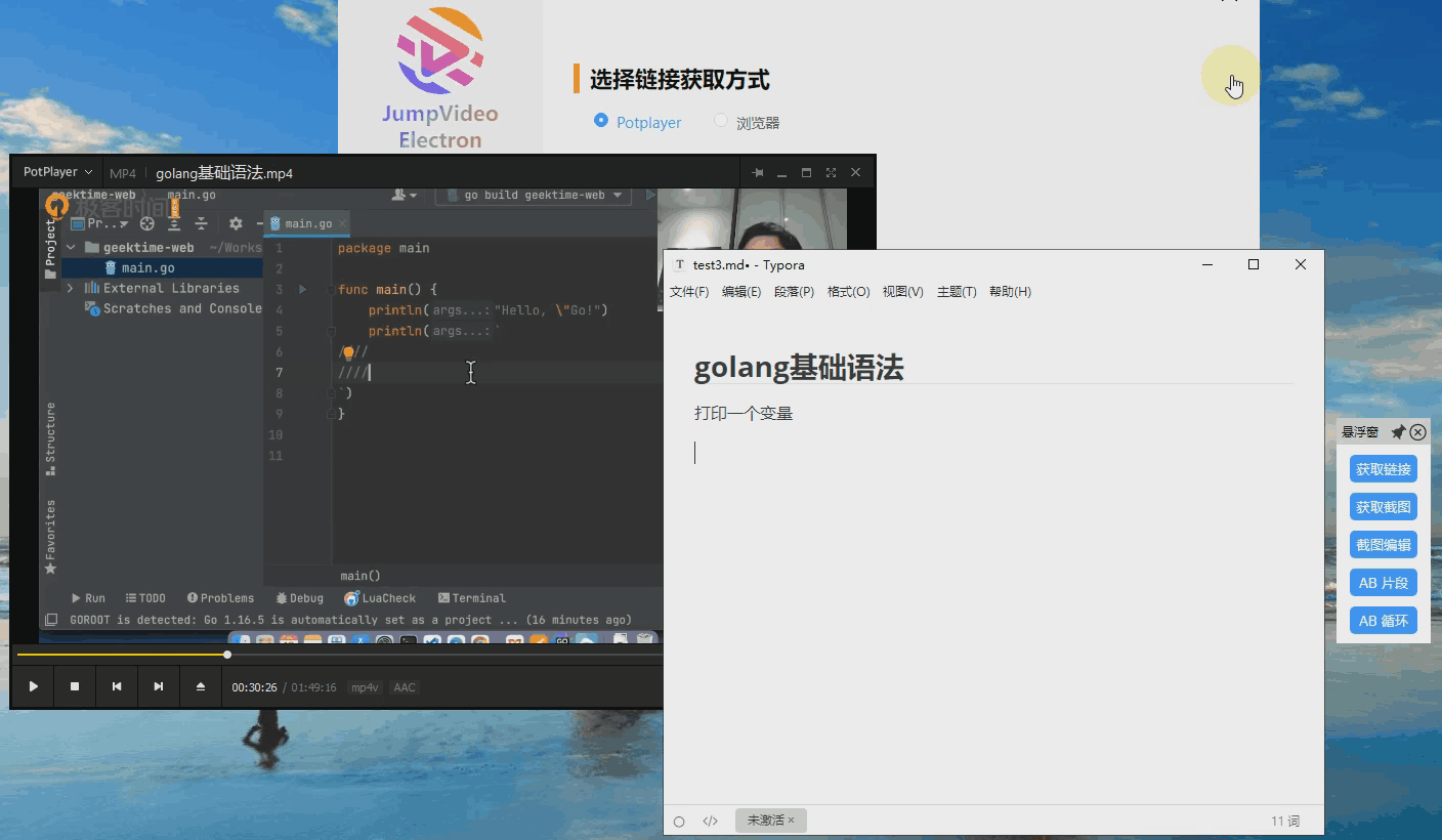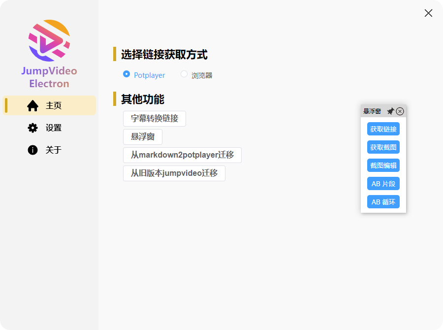 JumpVideo-Electron 通过链接,实现笔记到指定视频时刻跳转,支持potplayer、浏览器网页视频作为载体。可以将视频的某个时间点生成链接,方便从笔记中点击链接直达对应的视频播放点。支持视频链接,视频截图,AB片段,AB循环。