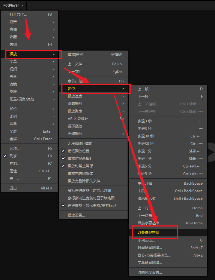 关闭【potplayer以关键帧为定位】,位置受【选项-播放-定位-以关键帧定位】关掉此选项。则跳转时间非常精准